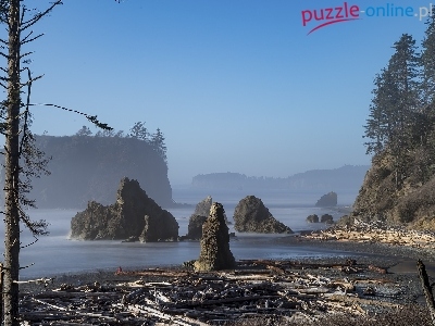 Stan Waszyngton, Wybrzeże, Drzewa, Ruby Beach, Stany Zjednoczone, Park Narodowy Olympic, Skały