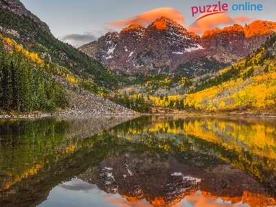 Stan Kolorado, Stany Zjednoczone, Odbicie, Szczyty Maroon Bells, Jezioro Maroon Lake, Jesień, Góry Skaliste, Drzewa