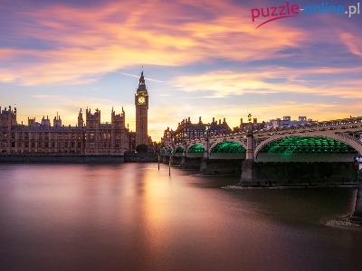 Londyn, Zachód słońca, Anglia, Wielka Brytania, Big Ben, Rzeka, Tamiza, Pałac Westminsterski, Wieża Zegarowa, Most