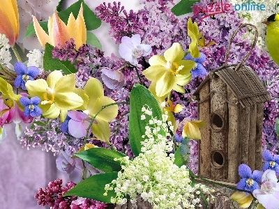 Budka, Czyż, Storczyki, Konwalie, Bez, Kwiaty, Czyżyk, Karmnik, Tulipany