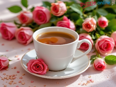 Kawa, Biała, Filiżanka, Róże, Kwiaty