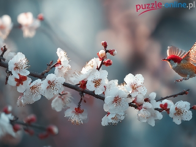 Białe, Czerwony, Drzewo owocowe, Grafika AI, Gałązka, Ptak, Kwiaty