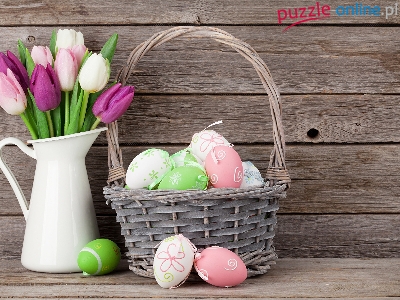 Pisanki, Deski, Koszyk, Kolorowe, Tulipany, Dzbanek, Bukiet, Białe