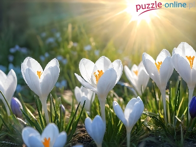Puzzle Kwiaty, Białe, Krokusy, Promienie słońca