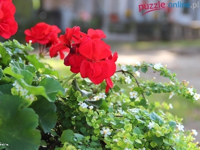 Puzzle Białe, Czerwone, Pelargonie, Kwiatuszki