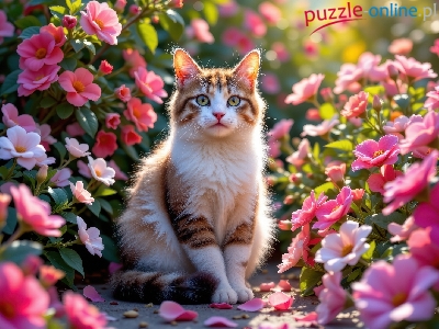 Siedzący, Kot, Rudo-biały, Kwiaty, Spojrzenie