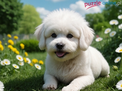 Pies, Biały, Szczeniak, Łąka, Kwiaty