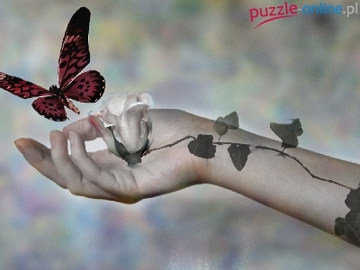 Bluszcz, Motyl, Biała, Róża, Ręka