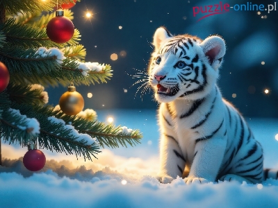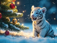 Choinka, Młody, Śnieg, Grafika AI, Zima, Tygrys, Bombki