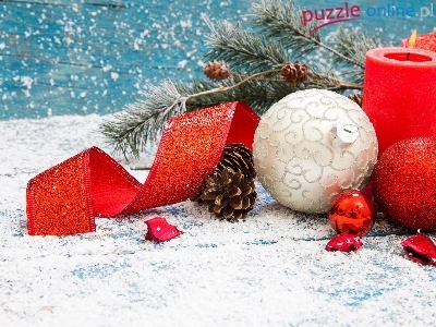 Stroik, Bombki, Świeczka, Gałązki, Kompozycja, Boże Narodzenie, Wstążka