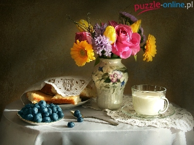 Borówki, Kwiaty, Mleko, Kompozycja, Bukiet, Ciasto
