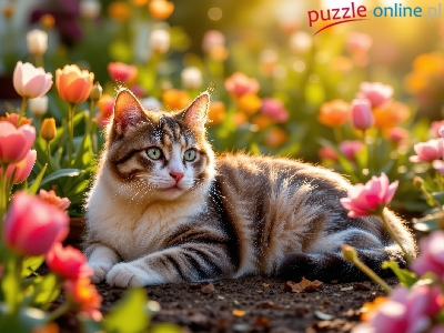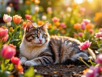 Leżący, Kot, Biało-brązowy, Tulipany, Kwiaty