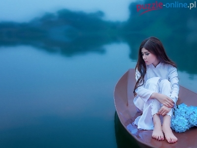 Puzzle Łódź, Zamyślona, Brunetka, Jezioro