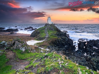 Skały, Walia, Wielka Brytania, Ynys Llanddwyn, Latarnia morska, Chmury, Zachód słońca, Morze, Niebo