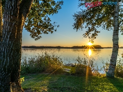 Drzewa, Brzeg, Łódka, Jezioro, Wschód słońca, Brzoza