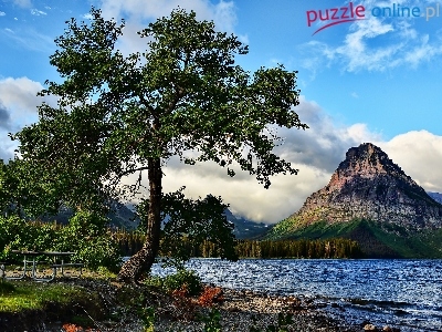 Brzeg, Ławka, Góry, Jezioro, Drzewa