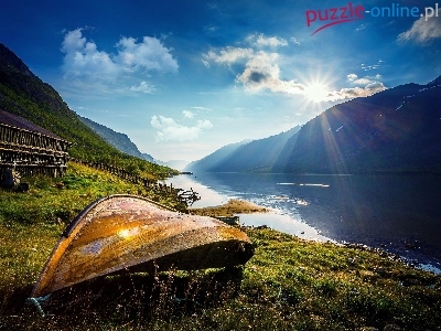 Jezioro Gjende, Park Narodowy Jotunheimen, Łódź, Norwegia, Góry Jotunheimen, Brzeg
