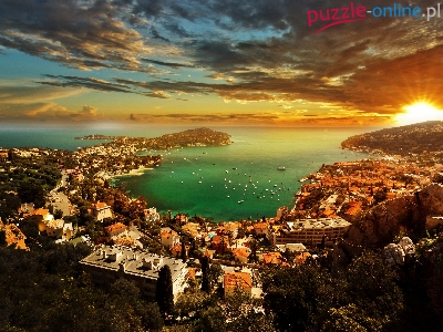 Budynki, Villefranche-sur-Mer, Wschód słońca, Lazurowe Wybrzeże, Statki, Morze Śródziemne, Francja, Półwysep Cap Ferrat, Chmury
