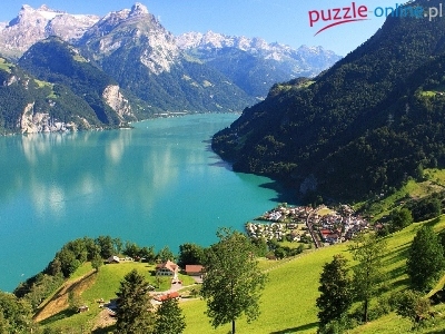 Puzzle Budynki, Góry, Jezioro, Drzewa