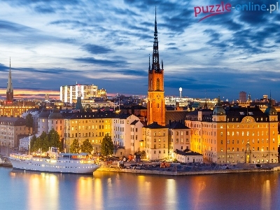Sztokholm, Statek, Budynki, Wyspa Riddarholmen, Zmierzch, Szwecja, Zatoka Riddarfjärden, Kościół