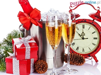 Dwa, Budzik, Kompozycja, Szampan, Sylwester, Kieliszki, Prezenty
