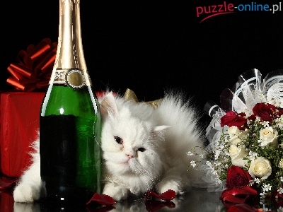 Puzzle Bukiet, Biały, Kotek, Szampan