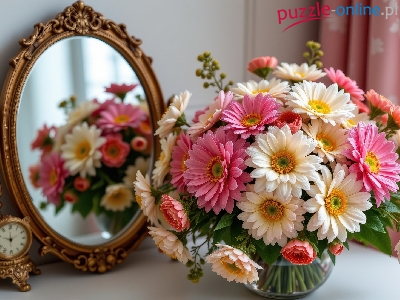 Zegar, Gerbery, Kwiaty, Bukiet, Grafika AI, Lustro