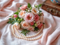 Tkanina, AI, Naszyjnik, Róże, Listki, Perły, Kwiaty, Bukiet