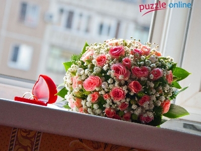 Bukiet, Obrączki, Okno, Parapet, Róż