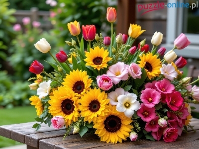 Puzzle Tulipany, Kwiaty, Słoneczniki, Bukiet