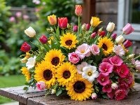 Tulipany, Kwiaty, Słoneczniki, Bukiet