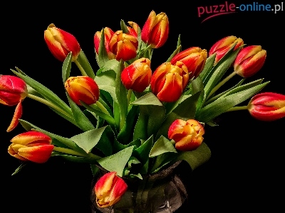 Tulipany, Bukiet, Tło czarne, Kwiaty, Czerwono-żółte, Wazon