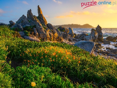 Kalifornia, Morze, Kwiaty Stany Zjednoczone, Zatoka Carmel, Łąka, Skały, Półwysep Monterey