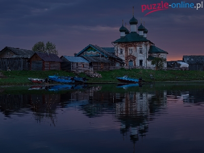 Cerkiew, Wieczór, Budynki, Obwód Archangielski, Miejscowość, Rzeka, Rosja, Kenozero