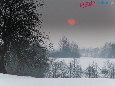 Puzzle Cerwone, Zima, Drzewa, Słońce
