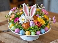 Miska, Zajączek, Wielkanoc, Chleb, Stół, Kwiaty