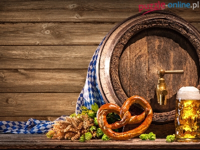 Deski, Kompozycja, Pszenica, Kufel, Piwo, Precel, Beczka, Chmiel