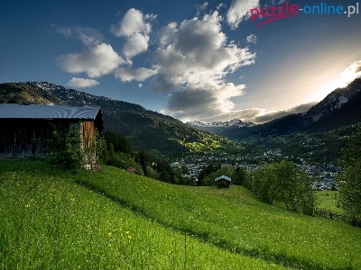 Chmury, Lasy, Panorama, Góry, Łąka, Domy