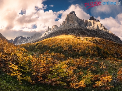 Chmury, Lasy, Jesień, Patagonia, Góry, Torres del Paine, Argentyna, Masyw