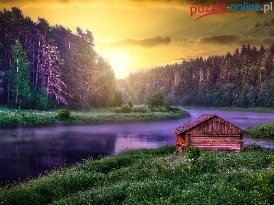Chmury, Zachód słońca, Zieleń, Drzewa, Rzeka, Chata, Las, Zakole