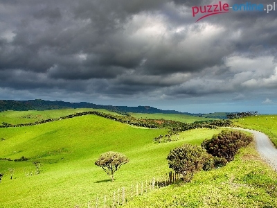 Chmury, Łąki, Droga, Ciemne, Zielone