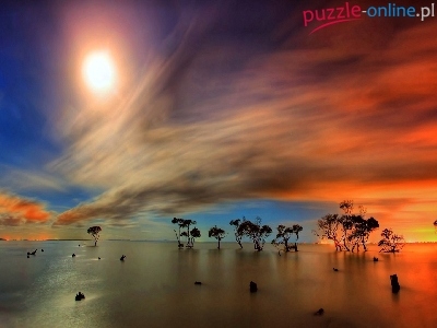 Chmury, Drzewa, Zachód Słońca, Czerwone, Woda