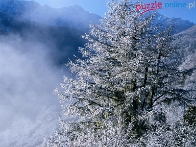 Puzzle Chmury, Góry, Drzewa, Zima