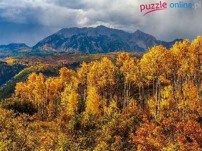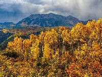 Góry, Jesień, Drzewa, Chmury, Pożółkłe, Las, Wzgórze
