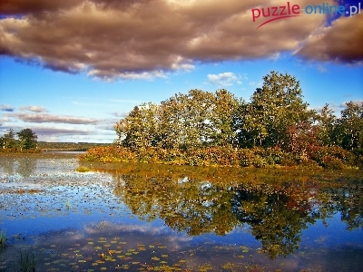 Puzzle Chmury, Jezioro, Drzewa, Jesień