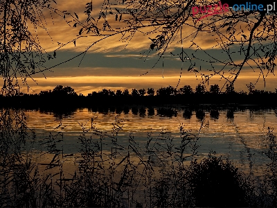 Jezioro, Zachód słońca, Chmury, Gałęzie, Drzewa