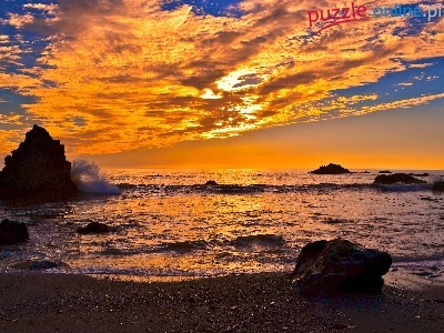 Chmury, Skały, Słońca, Morze, Fale, Zachód