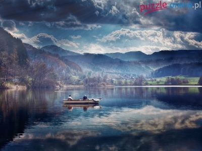 Góry, Chmury, Łódka, Domy, Jezioro, Lasy, Wędkarze