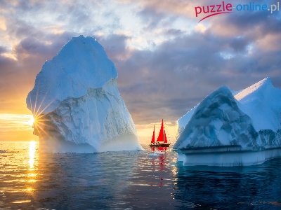 Grenlandia, Żaglówka, Góry lodowe, Wschód słońca, Dania, Chmury