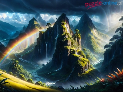 Chmury, Deszcz Fantasy, Paprocie, Góry, Przebijające światło, Skały, Grafika, Tęcza